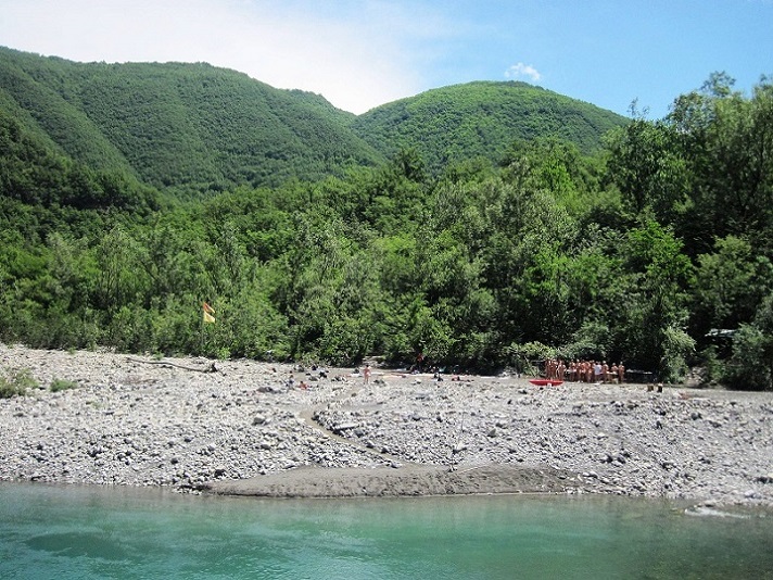 Intanto rispondeva Alfredo che ci diceva che in alto era piovuto pochissimo, il fiume era perfetto, pulito e diminuito di livello quindi in 4 rompevamo gli indugi (clau, patty, claudio, elena) e iniziavamo a scendere e arrivati in spiaggia c’era solo un capitano (1cino)… le 2 bandiere TrebbiaNat e A.N.ITA. che non avevamo ammainato il giorno prima sventolavano e iniziavamo a portare i tavoli in spiaggia ma dovevamo subito ricoprirli e tirare il telo in sala pranzo per gli ultimi 10 min di pioggia leggera quando l’azzurro compariva dal Brugnello e si allargava a dismisura, finalmente usciva un sole caldo che non ci avrebbe più abbandonato per tutta la giornata e le nuvole… letteralmente sparite dall’orizzonte!!! :shock: