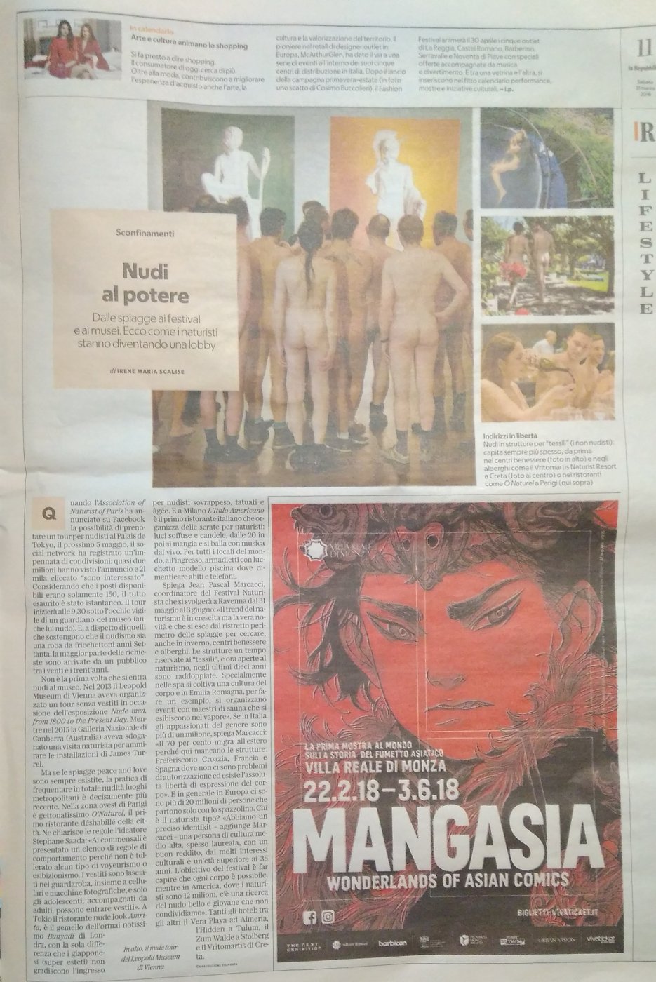 Su Repubblica di oggi (31/03/2018) un articolo che prende spunto dal museo parigino che per una serata sarà visitabile in nudità, per parlare di altre attività nudo naturiste.