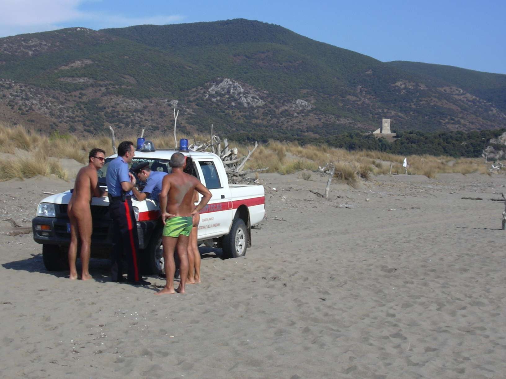 Dopo aver dato le proprie generalità e dopo aver fatto mettere a verbale che vi era una sentenza del giudice di Grosseto che sostanzialmente autorizzava il naturismo su quella spiaggia, chiese che fossero prese le generalità anche di tutti i presenti che nel frattempo si erano messi in coda nudi con il documento in mano.