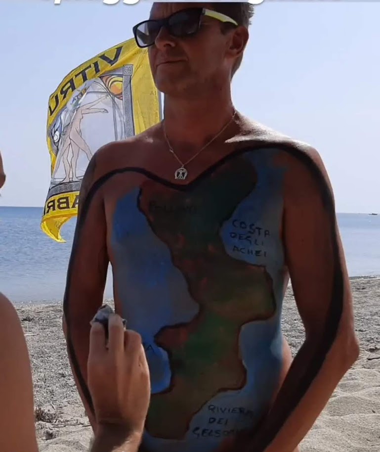 Almeno tre ore penso di aver dormito, stremato. Certo non ho fatto la doccia, non ho lavato i denti ma esistono appunto i vigorsol. Al mattino mi raggiungono Emanuele e Renato. Ormai siamo un trio affiatato e si si va in spiaggia. Avevo espresso il desiderio di essere una tela umana per il body painting ma il risultato è sconvolgente. Divento la mappa umana della Calabria.