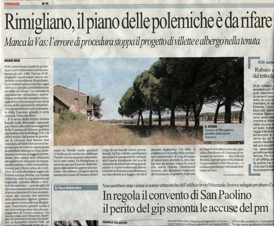 Noi crediamo che questo tempo sia stato guadagnato, e che se oggi si insedia una commissione di persone tenute a riflettere sull’incompatibilità del piano con le norme ed i principi del PIT, se la direzione regionale del ministero per i beni e le attività culturali dichiara che qualsiasi opera sarà ritenuta illegittima, questo tempo “perso”, che ci consegna una realtà ancora intatta, sia un’enorme e definitiva occasione per tutti per guardare alla tenuta di Rimigliano come a un bene comune da ripensare fuori dalla stolta logica del ritorno immediato di pochi.