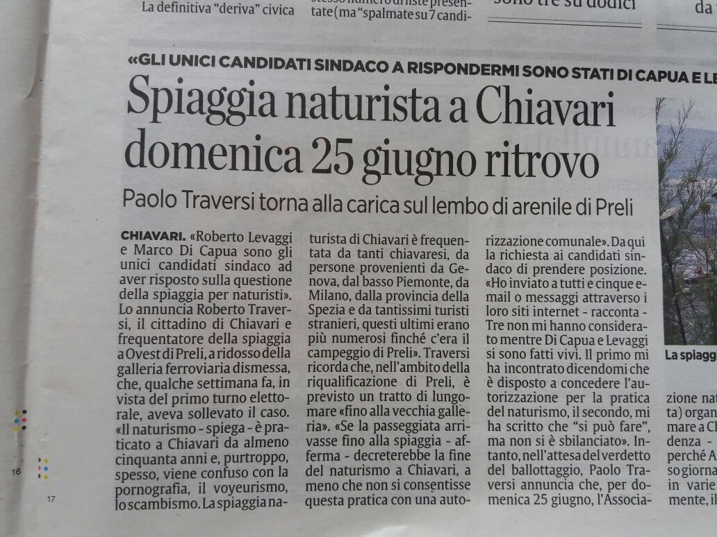 In gioco vi è la possibilità di mantenere o meno la spiaggia naturista di quella località e solo un particolare impegno della nostra associazione potrà far si di ottenere dei risultati positivi per il mantenimento ed il riconoscimento ufficiale di questa spiaggia. Per questo si spera che domenica 25 sia numerosa la presenza dei soci liguri a garantire una festante e qualificata presenza in quella localtià.