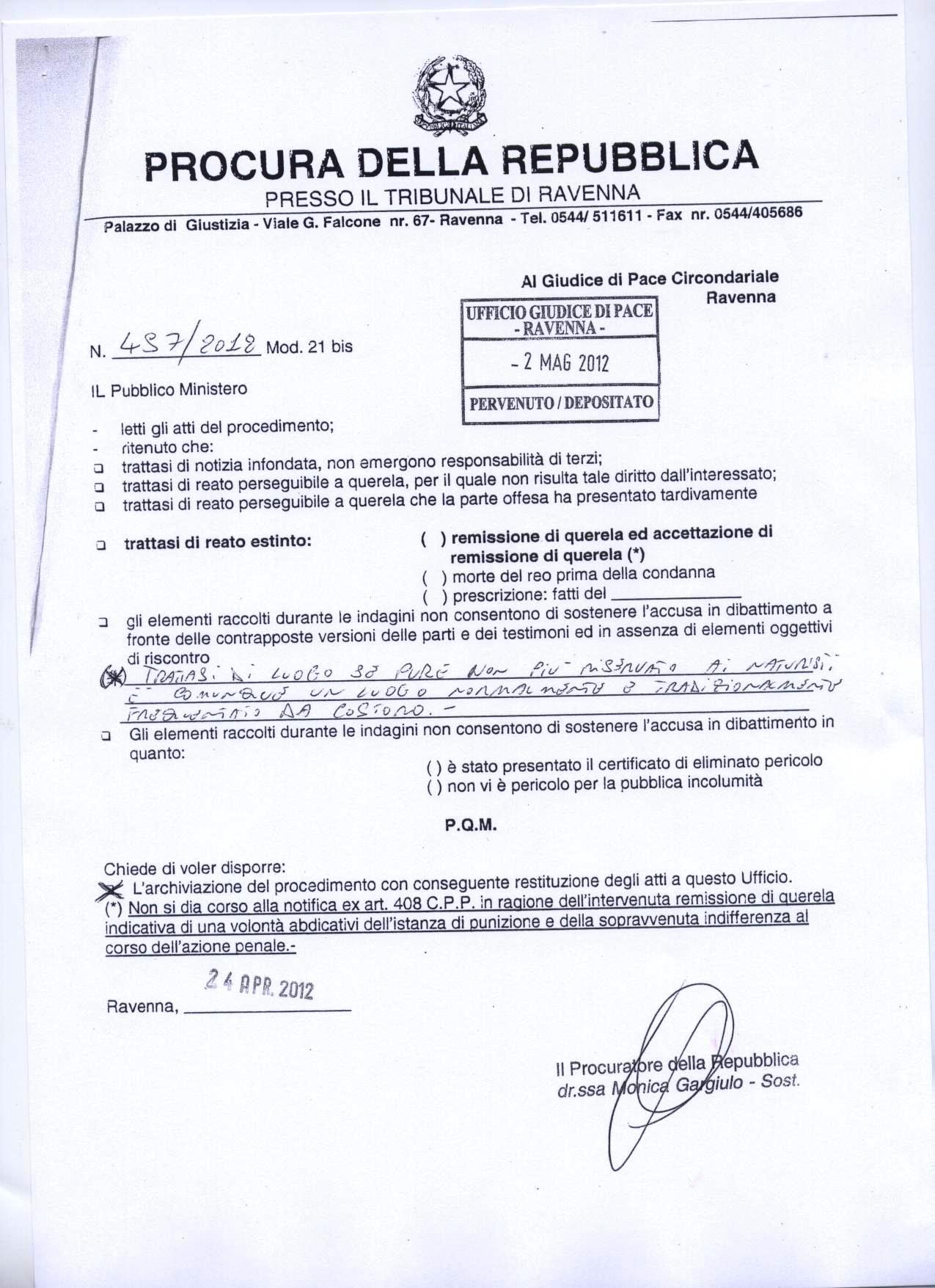 Augurandovi una splendida estate naturista alla Bassona , via allego copia della prima ARCHIVIAZIONE richieta dal Pubbblico Ministero, poi disposta dal GIP di Ravenna, presso il Giudice Di Pace, per una libera esposizione di un socio al primo sole del 26.3.2012.