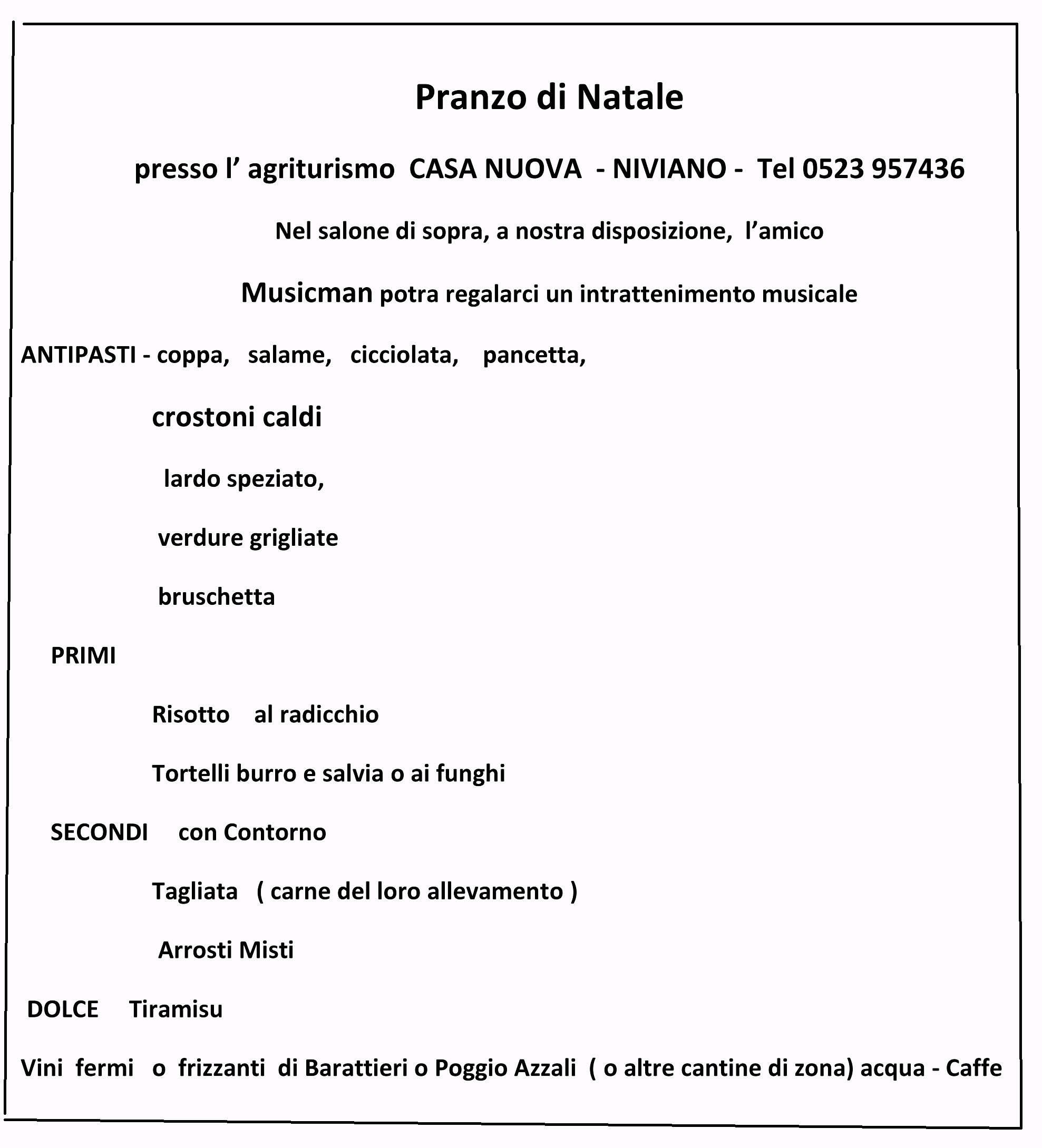 Dopo due anni a La Cantinetta quest’anno il gruppo ha deciso di provare un posto nuovo pertanto il pranzo di Natale TrebbiaNat si terrà il giorno 14 Dicembre 2014 presso l’agriturismo Loc. Casa Nuova 31 di Carlo Pontini a Niviano di Rivergaro (PC) situato tra le colline della Val Trebbia sulla strada Cementirossi tra Niviano e Grazzano Visconti a una decina di Km da Piacenza e pochi Km prima di Rivergaro.