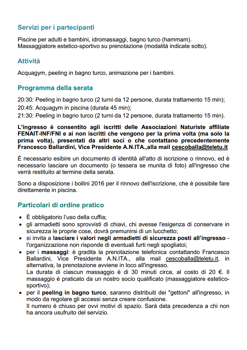 Si potranno raccogliere ulteriori prenotazioni inviando una mail a Francesco Ballardini ( cescoballa@teletu.it ) o a eventi@naturismoanita.it ) o, solo per chi è già socio, presentarsi direttamente all'ingresso della piscina.