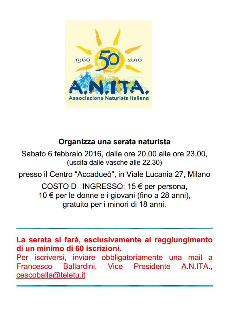LA SERATA E' CONFERMATA, POTETE CONTINUARE A ISCRIVERVI FINO A SABATO INVIANDO MAIL AD eventi@naturismoanita.it