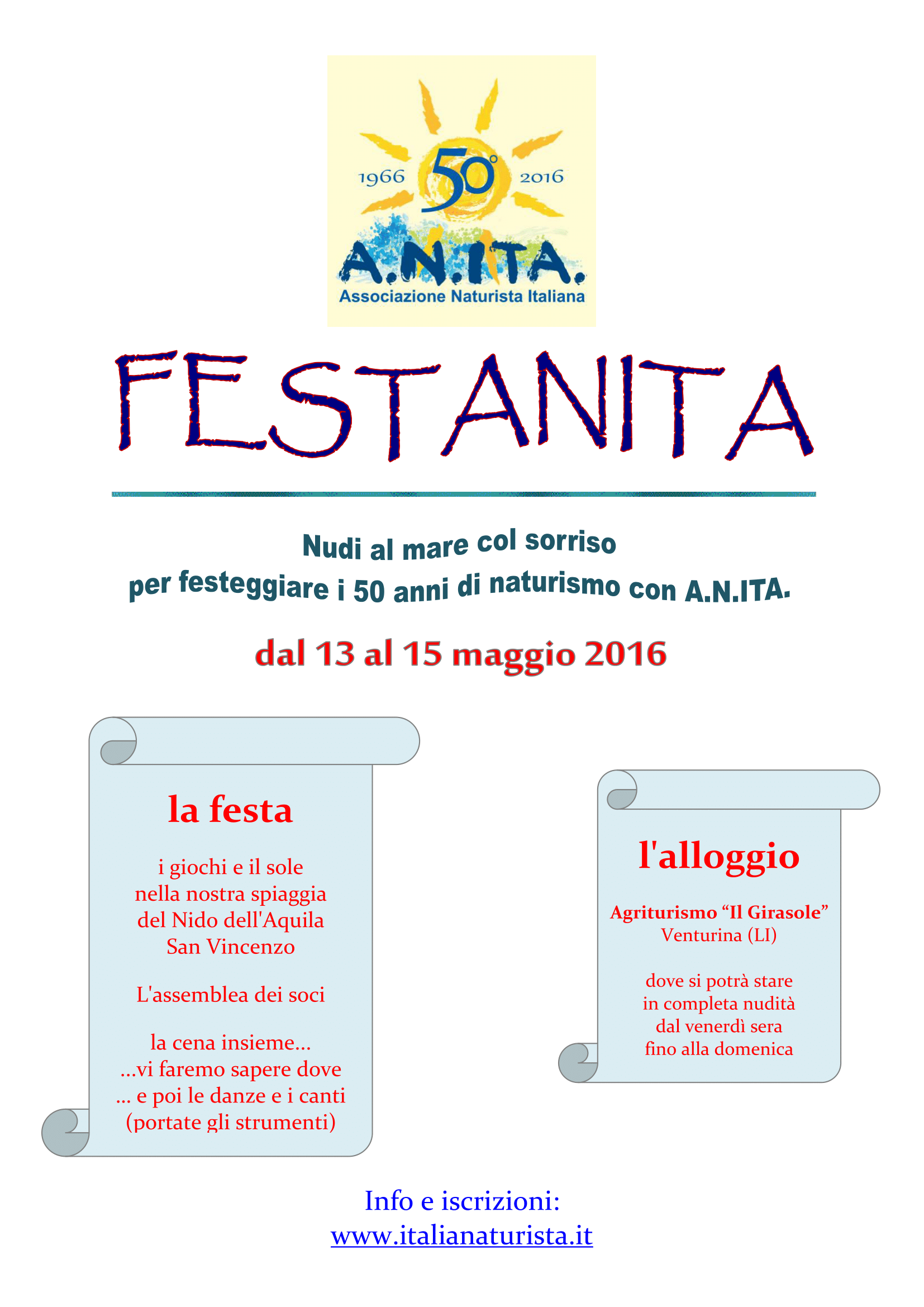 Quest’anno organizzeremo la consueta assemblea annuale a S. Vincenzo presso la Sala Esposizioni del Comune in Piazza del Municipio, in una due giorni che comprenderà assemblea ordinaria e straordinaria (per la modifica dello statuto) il 14 Maggio e una giornata di festa in spiaggia il 15 che celebrerà in allegria i 50 anni dell’associazione. A tale proposito abbiamo riservato una intera struttura, “Il Girasole”Via dei Granai, 27B, a Venturina (LI) che per l’occasione ci consentirà il naturismo e che affitteremo a prezzi vantaggiosi per tutti coloro che vorranno esserci.