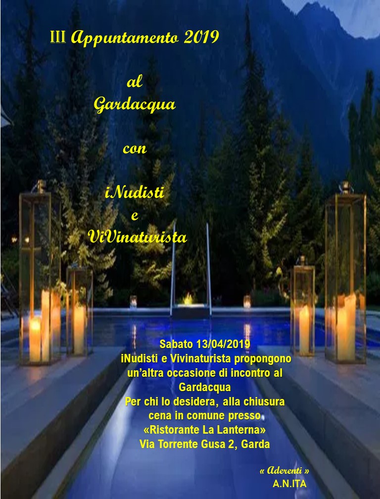 L’ingresso al Gardacqua è riservato a tutti i componenti della grande comunità nudonaturista che abbiano prenotato la propria presenza all'email indicata sotto fino al limite di 60 posti