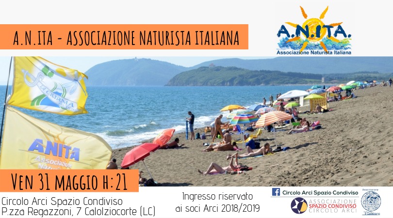 Vi segnalo questo evento che ci permette di presentare il Naturismo. Insieme a Sergino e probabilmente ad altri amici Naturisti che abitano in zona Lecco, sarò venerdì 31 maggio 2019 al Circolo ARCI - Spazio Condiviso di Calolziocorte a raccontare, a chi Naturista non lo è, la nostra storia, le nostre motivazioni.