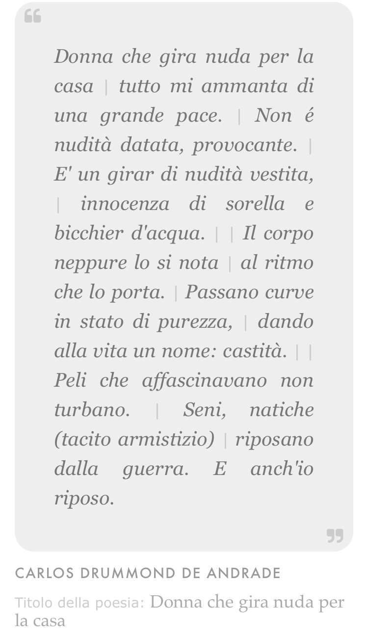 Mi è rimasto dall’infanzia il gusto della nudità liberatoria, rinfrescante per l’anima, nel senso che le dai tu, Alda. Da nuda, non puoi falsificare niente, e ti rigeneri in te, senza altri bisogni attorno a disturbare.
